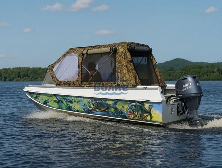 Тент с задней дверью для выхода к мотору, небольшими боковыми окнами и усиленными краями для установки застёжек. Изготовлен из специализированной тентовой ткани Оксфорд 600 повышенной плотности